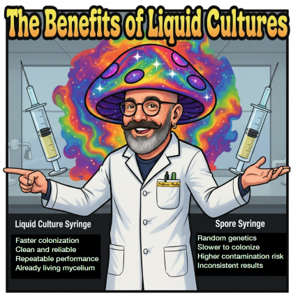 Liquid cultures are a superior choice over spore syringes because they contain live, growing mycelium rather than dormant spores, which means they establish growth much faster, more reliably, and with greater consistency. Unlike spore syringes, which can produce variable results and carry a higher risk of contamination, liquid cultures are already colonized and ready to expand, leading to cleaner and more predictable outcomes. This makes them the smarter option for researchers and cultivators who value efficiency, reduced risk, and dependable results.